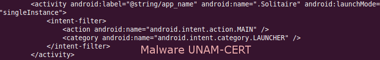 Almost at the end of the manifest file, on the “Activity” label, it is specified the first code section that will execute after the application is opened, which in this case is “.Solitaire”.